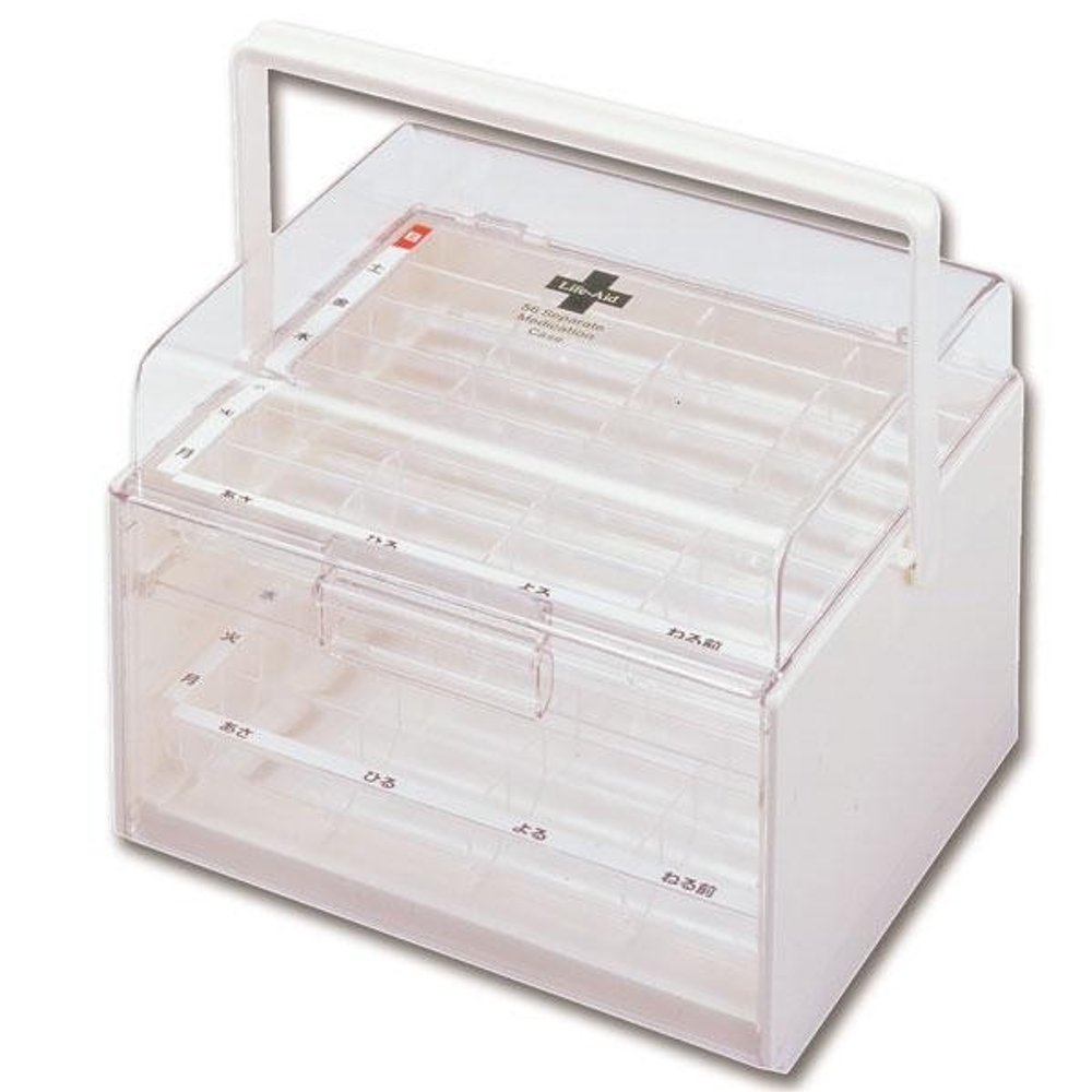 2週間分のお薬をあさ・ひる・よる・ねる前に区分け整理できるくすり整理ケースです。1週間ごとに上下のトレーを入れ換えて使います。
